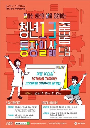“광주 ‘청년 13(일+삶)통장’ 지원 확대를…”. 광주시, 450명 모집에 2천171명 신청 ‘경쟁 치열’. 탈락자들 “그림의 떡”…市 “규모 확대 위해 국비 신청”. 광주광역시가 저임금 근로 청년들의 목돈 마련을 위해 추진한 ‘청년 13(일+삶)통장’지원사업의 확대를 바라는 목소리가 높다. 29일 광주시에 따르면 시는 지난 27일 ‘청년 13(일+삶)통장’ 지원사업 공모에 선정된 근로 청년 450명을 발표했다. 지난 23일 마감한 이번 2차 모집에는 총 2천171명이 신청했다. ‘청년 13(일+삶)통장’은 매월 10만원을 10개월 동안 저축하면 광주시가 100만원을 더해서 200만원의 목돈을 마련해주는 사업이다. 시중 은행의 저축통장과 비교할 수 없을 만큼 이자율이 높은 셈이어서 청년들에게 인기가 높다. 지난 7월 시행된 같은 취지의 ‘청년비상금통장’사업에서도 200명 모집에 2천589명이 신청하는 등 경쟁이 치열했다. 시도 이러한 상황을 반영해 이번 ‘청년 13(일+삶)통장’은 모집인원을 두배 이상 늘렸다. 하지만 근로 청년들의 기대치에는 아직도 미흡하다는 반응이다. 지난 7월 비상금통장에 비해 신청방법이 쉬워지고 모집인원도 늘었지만 여전히 대상자로 선정되기가 힘들기 때문이다. 서구 쌍촌동에 살고 있는 이모(26)씨는 “지난 7월에 신청한 ‘청년비상금통장’ 사업에 떨어져 신청자 수를 알아봤더니 경쟁률이 상당했다”며 “이번 13통장도 비슷한 상황일 것으로 여겨져 신청하지 않았다”고 말했다. 지난 번에 이어 이번에도 탈락한 박모(26)씨는 “1년 동안 100만원을 저축하면 200만원을 마련할 수 있어 관심을 갖고 신청했는데 탈락해 실망스러다”며 “탈락자들에게는 그림의 떡에 불과하기 때문에 시에서 혜택을 조금 줄이더라도 모집인원을 확대하면 좋겠다”고 희망했다. 이에 대해 광주시 관계자는 “이 사업이 청년들에게 인기가 높아 규모를 확대하기 위해 내년에 국비를 신청했다”며 “하지만 현재 광주시는 일자리 창출에 무게를 두고 있어 모집인원을 더 늘리기는 사실상 힘든 상황이다”고 말했다.