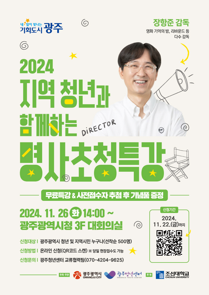 광주광역시(시장 강기정)는 26일 오후 2시 시청 대회의실에서 장항준 영화감독을 초청해 ‘2024 지역청년과 함께하는 명사 청년특강’을 연다.