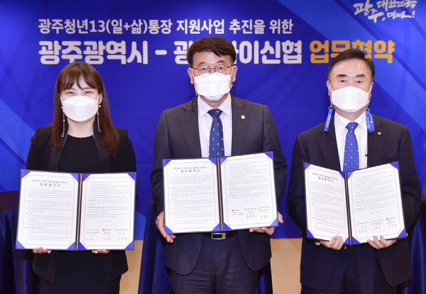 지역조합인 광주와이신협은 코로나19가 지속되면서 불안정한 근로환경에 놓인 근로 청년들을 위해 15일 시청에서 광주시, 청년금융복지지원센터와 '청년13(일+삶)통장 지원 사업' 추진을 위한 업무협약을 체결하고 후원금을 기탁했다.