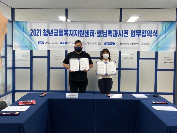 이번 협약식은 지난 6월 23일 오후 2시 청년금융복지지원센터 2층에서 ‘청년금융복지지원센터’의 구문정 부센터장과 ‘호남백과사전’의 강진교 대표를 비롯해 해당 관계자들이 참석한 가운데 진행됐다.