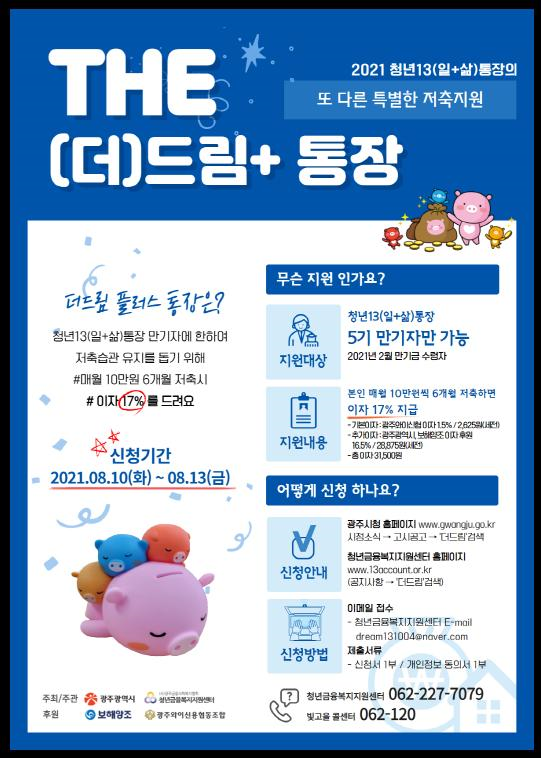 ‘더드림플러스통장 사업’은 2019년 시행 후 340여 명의 청년을 지원한 정책으로, 청년13통장 만기 청년들에게 월 10만원씩 6개월간 적립 후 적금 이율 17% 상당의 만기축하 이자(최대 3만1,500원)를 지원한다.