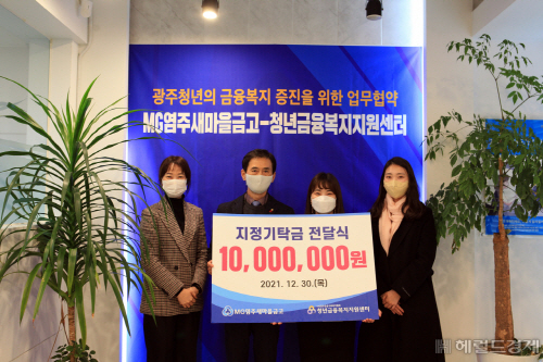 서민금융협동조합인 MG염주새마을금고는 불안정한 근로환경에 놓인 청년들을 위해 후원금으로 1000만원을 청년금융복지지원센터에 지정 기탁한다.
